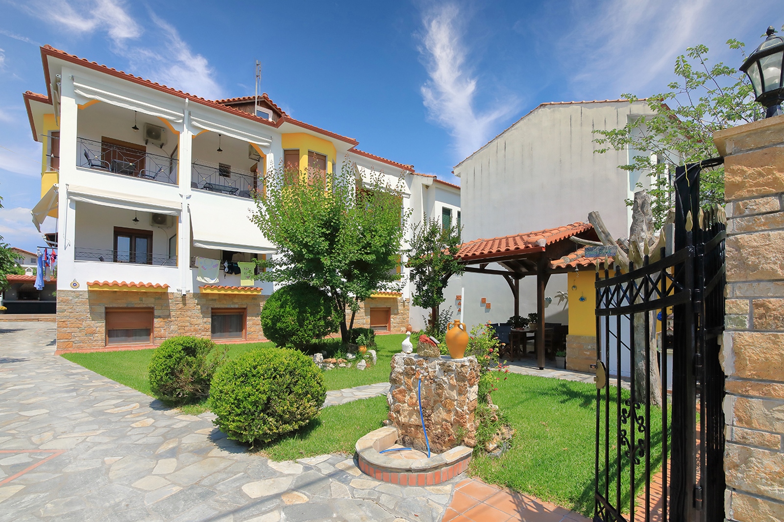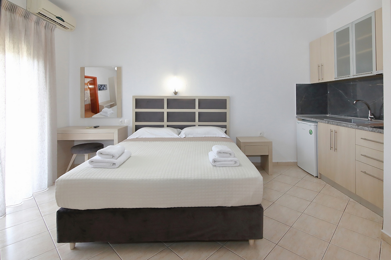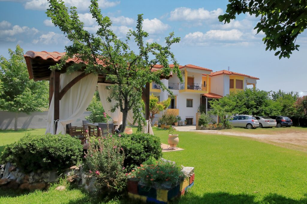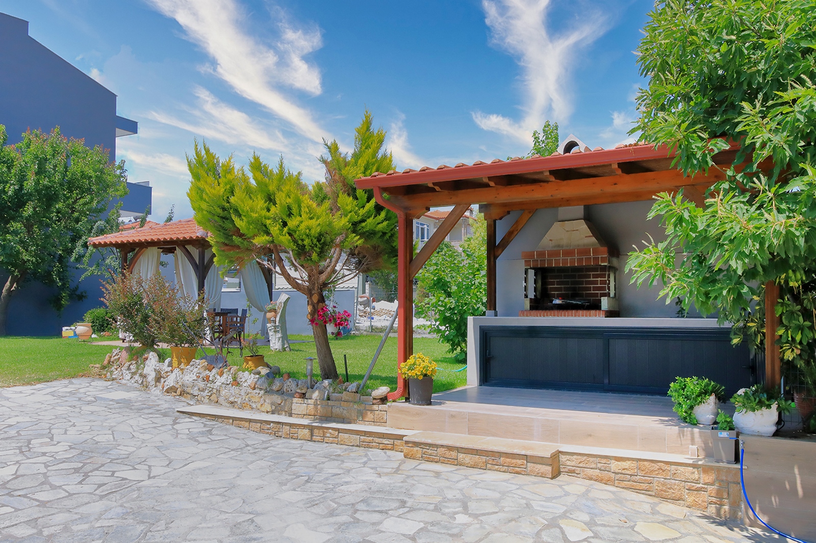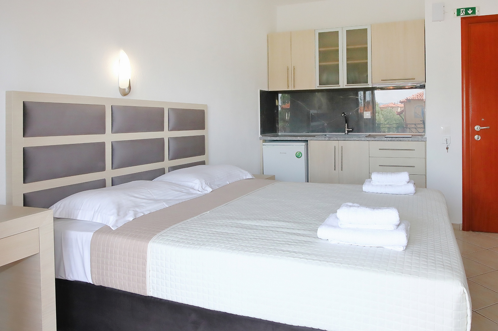 The modern complex “STUDIOS ANNIO” is located near the tourist center of Nikiti, 100 meters from the sandy beach. Surrounded by a beautiful garden with lawn, flowers, trees, a gazebo with barbecue and private parking. It has 8 studios and 1 two-room apartment that can accommodate up to 4 people and there is the possibility of extra bed upon request. All of our apartments are decorated with modern stylish furniture and fully equipped to ensure a comfortable stay.
