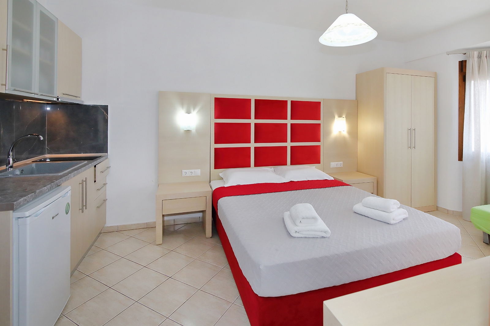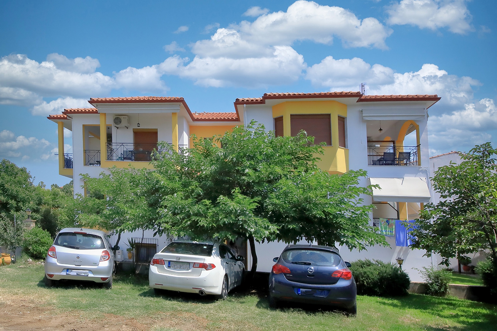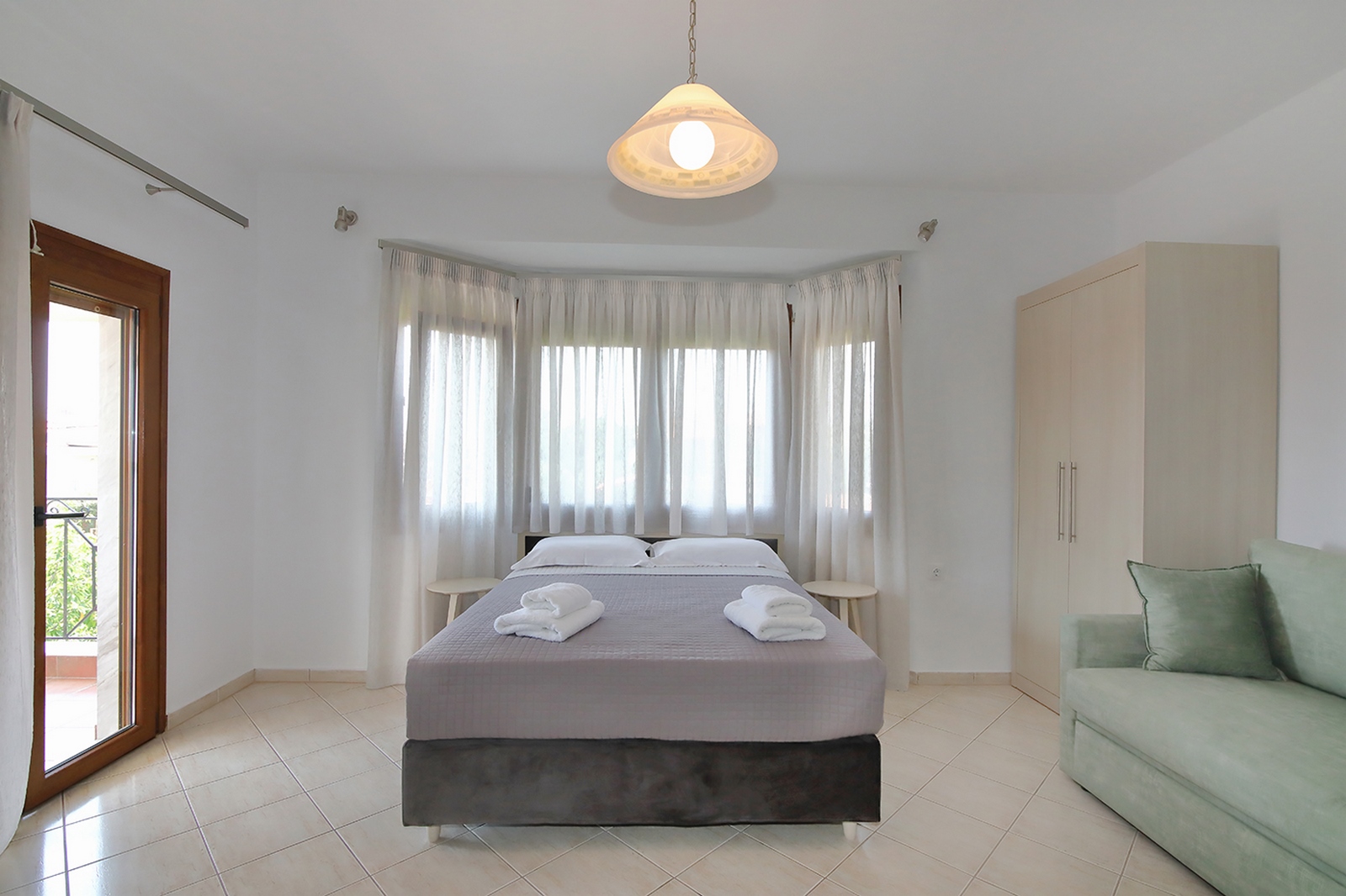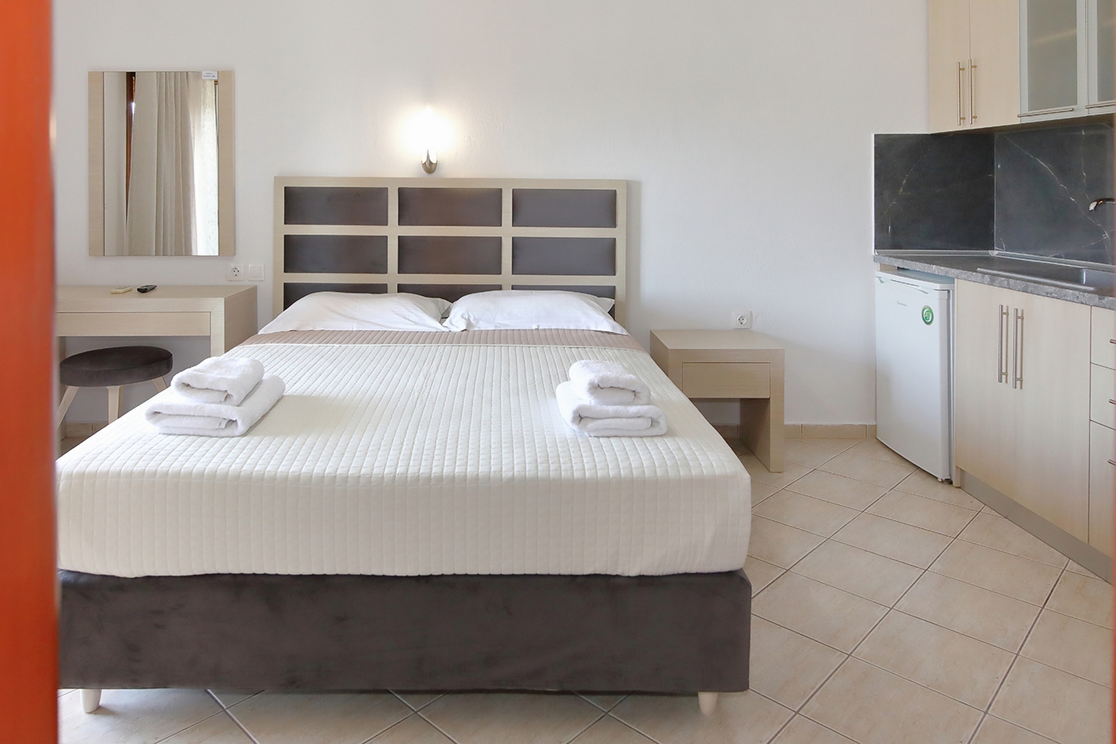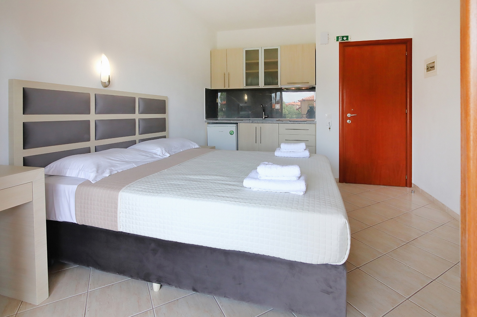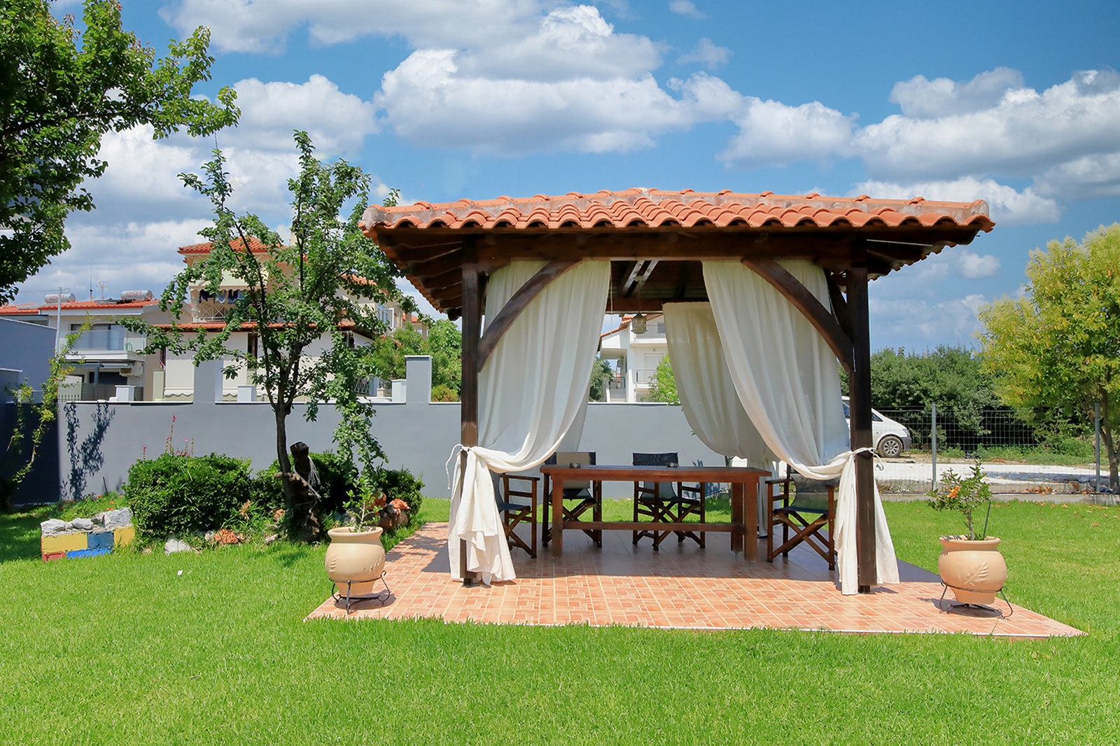 The modern complex “STUDIOS ANNIO” is located near the tourist center of Nikiti, 100 meters from the sandy beach. Surrounded by a beautiful garden with lawn, flowers, trees, a gazebo with barbecue and private parking. It has 8 studios and 1 two-room apartment that can accommodate up to 4 people and there is the possibility of extra bed upon request. All of our apartments are decorated with modern stylish furniture and fully equipped to ensure a comfortable stay.
