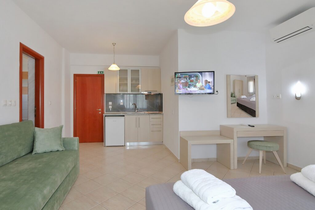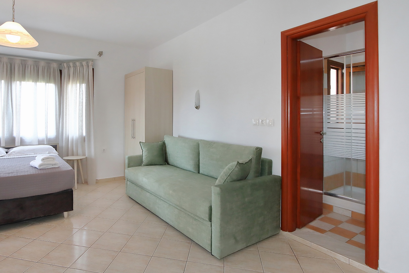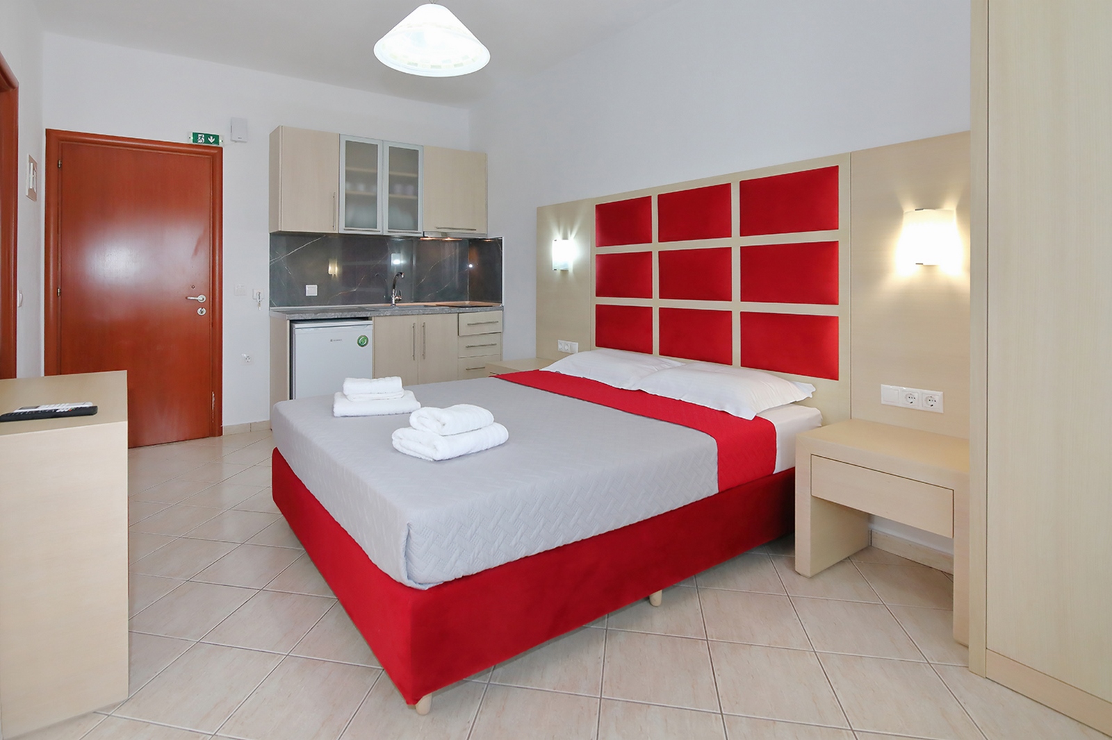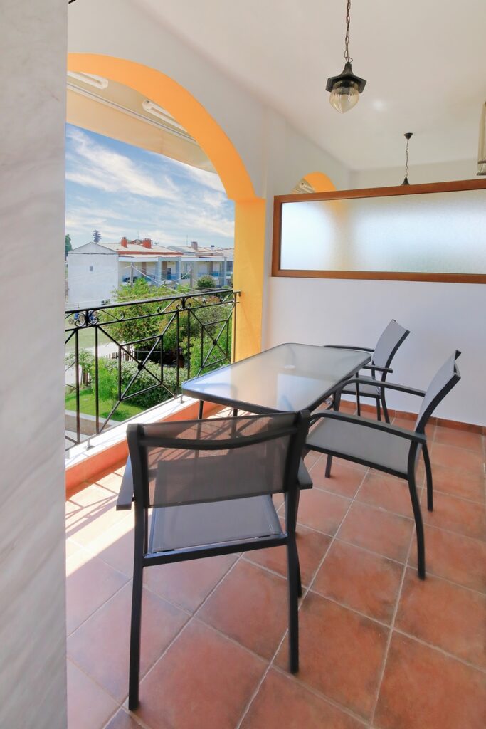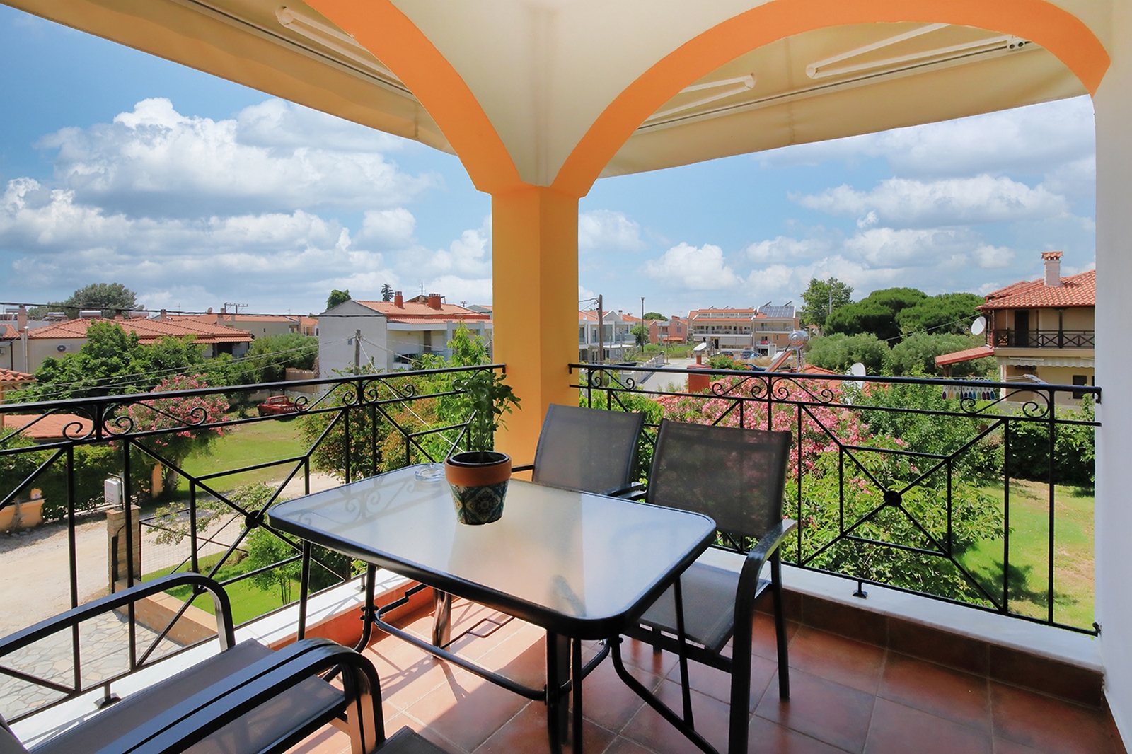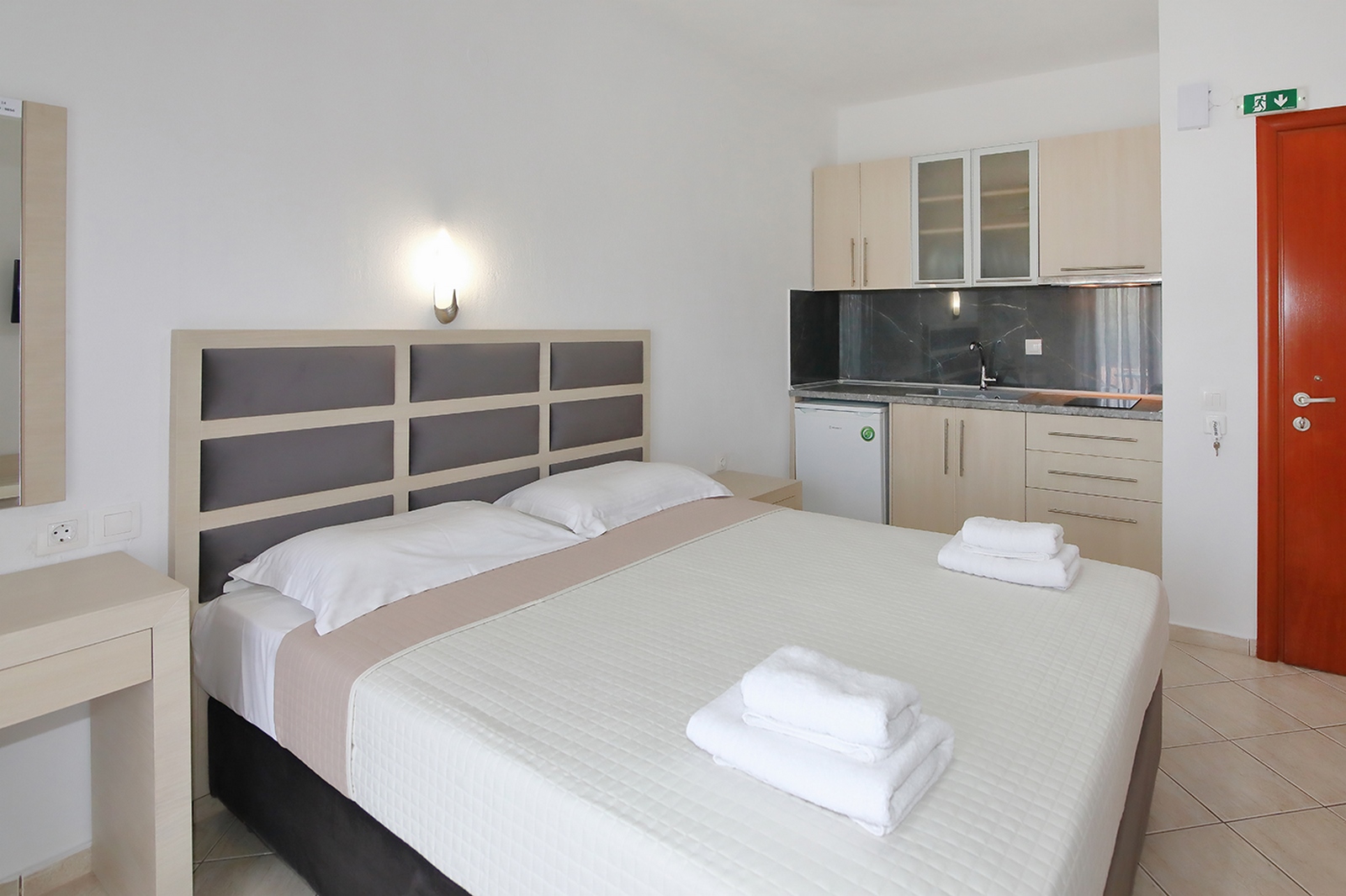 The modern complex “STUDIOS ANNIO” is located near the tourist center of Nikiti, 100 meters from the sandy beach. Surrounded by a beautiful garden with lawn, flowers, trees, a gazebo with barbecue and private parking. It has 8 studios and 1 two-room apartment that can accommodate up to 4 people and there is the possibility of extra bed upon request. All of our apartments are decorated with modern stylish furniture and fully equipped to ensure a comfortable stay.