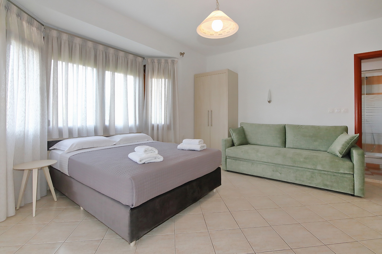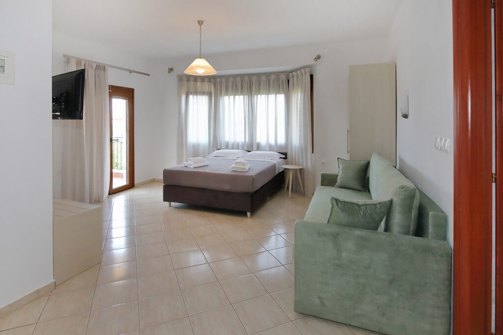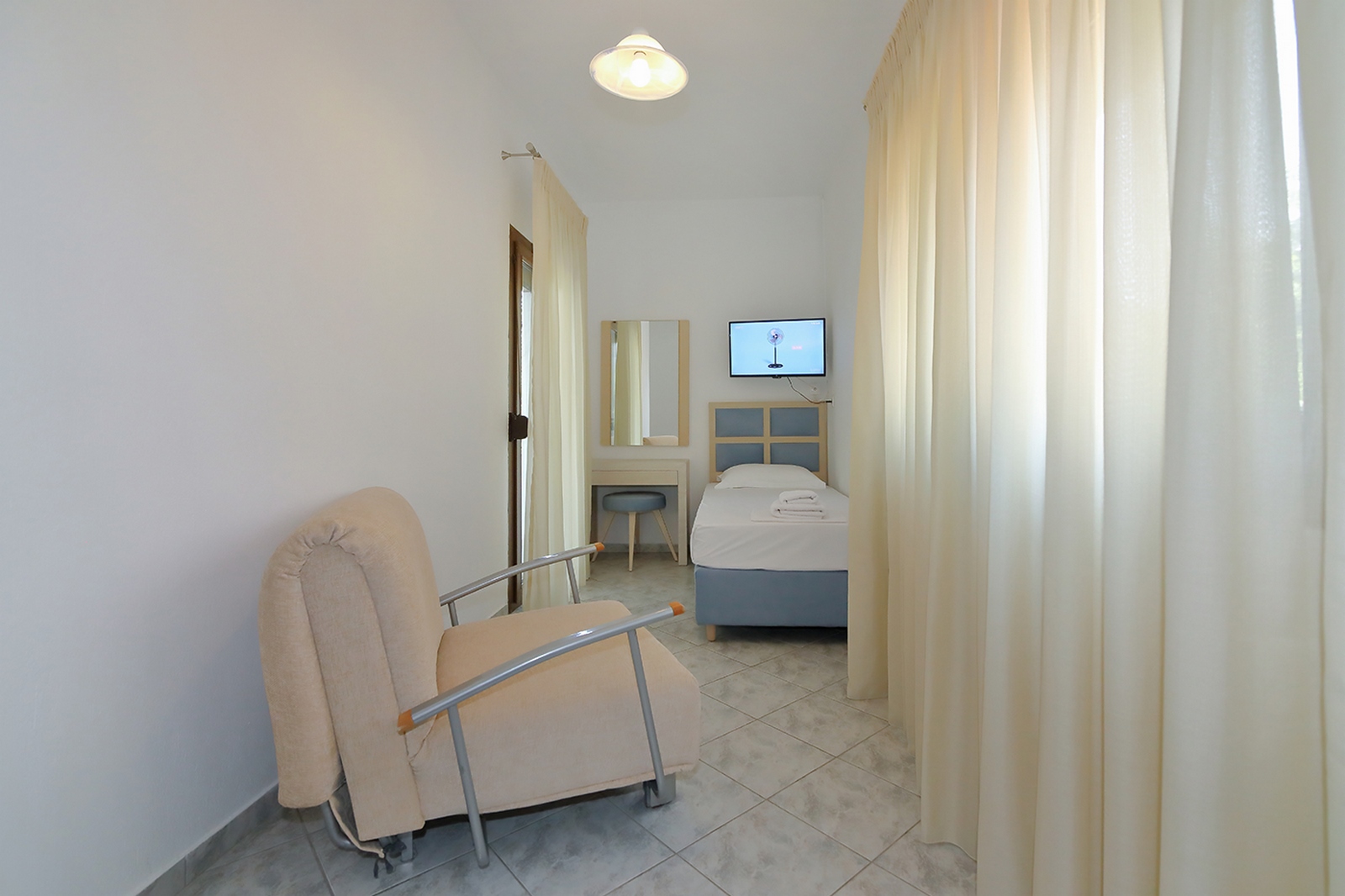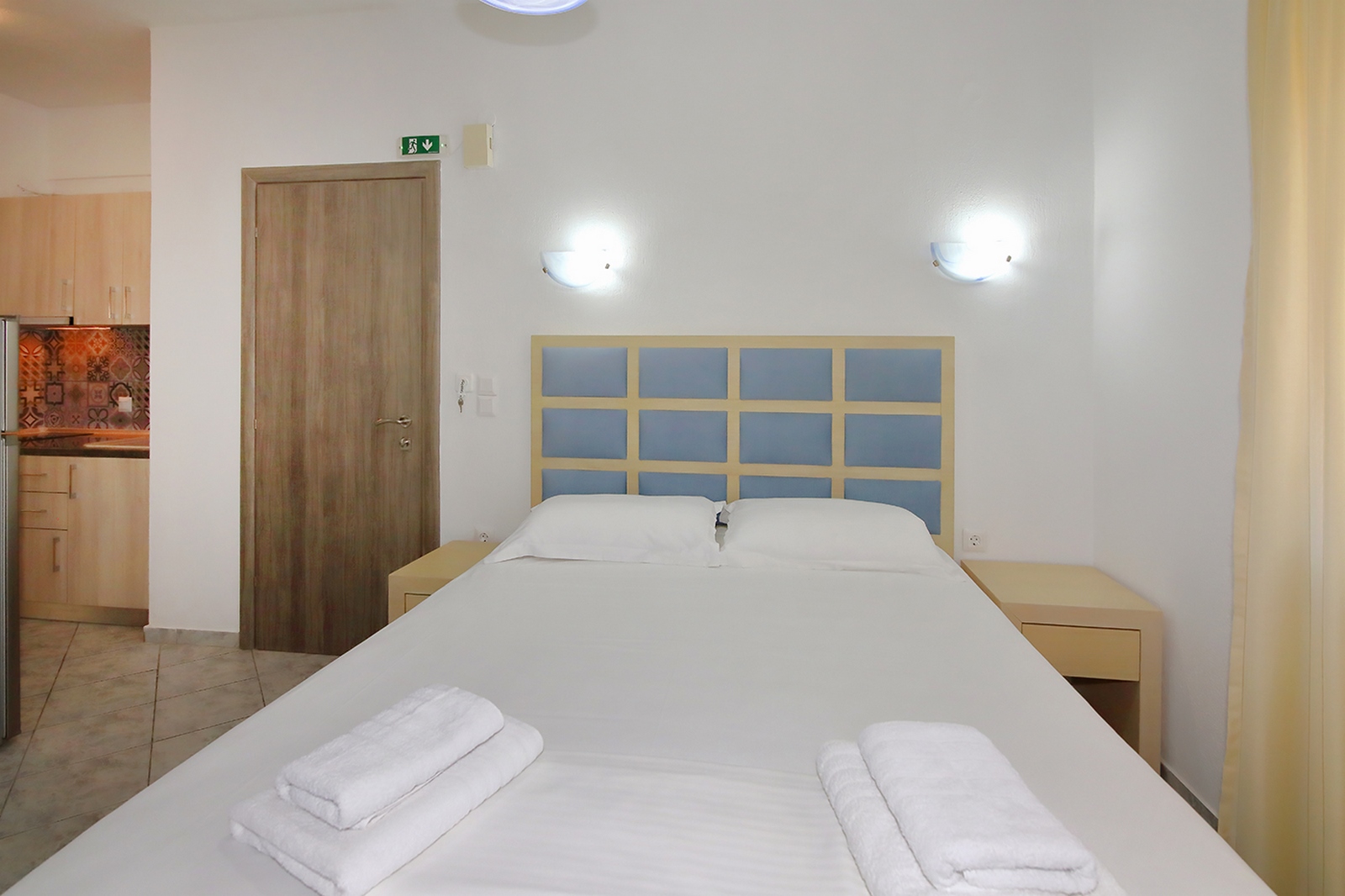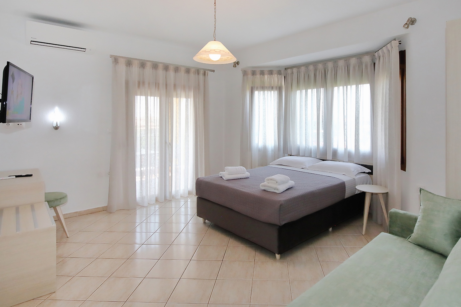 The modern complex “STUDIOS ANNIO” is located near the tourist center of Nikiti, 100 meters from the sandy beach. Surrounded by a beautiful garden with lawn, flowers, trees, a gazebo with barbecue and private parking. It has 8 studios and 1 two-room apartment that can accommodate up to 4 people and there is the possibility of extra bed upon request. All of our apartments are decorated with modern stylish furniture and fully equipped to ensure a comfortable stay.