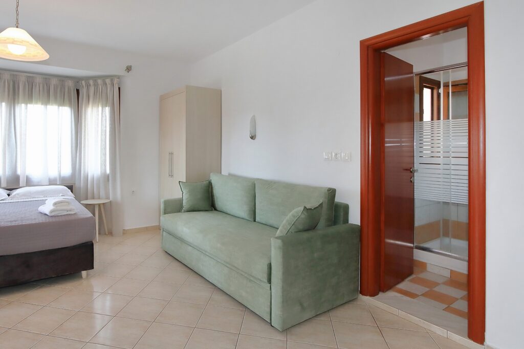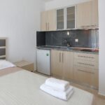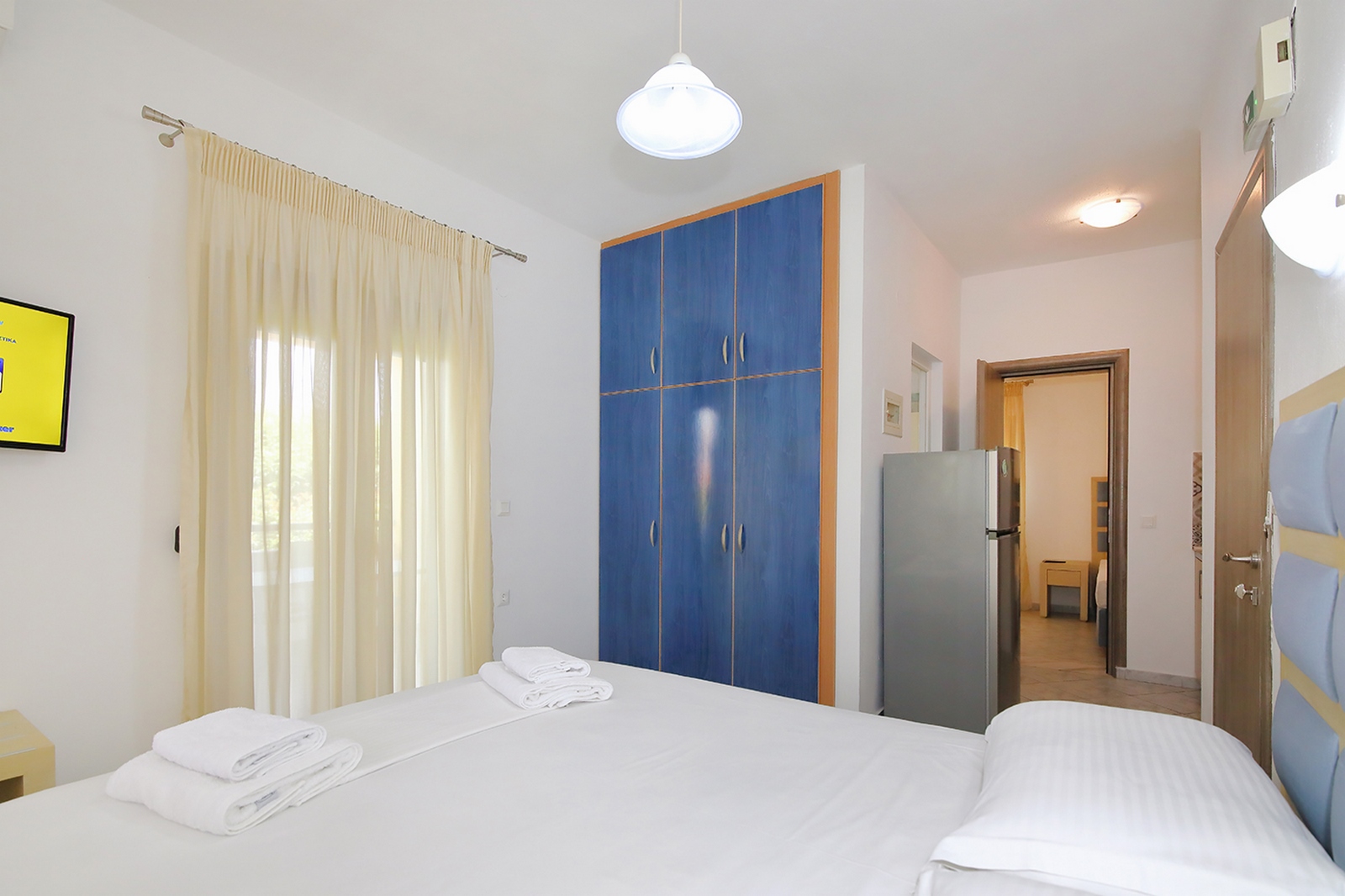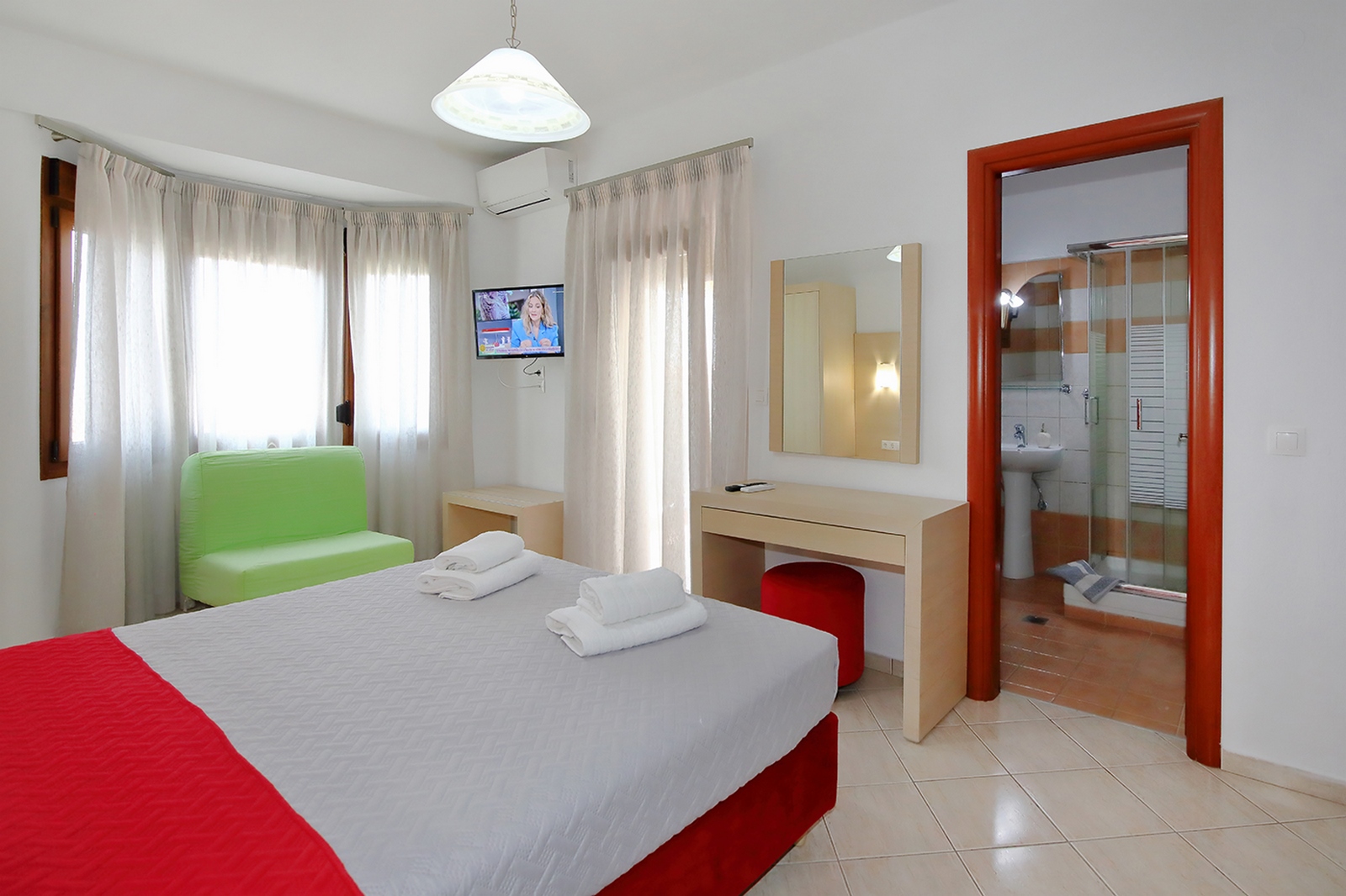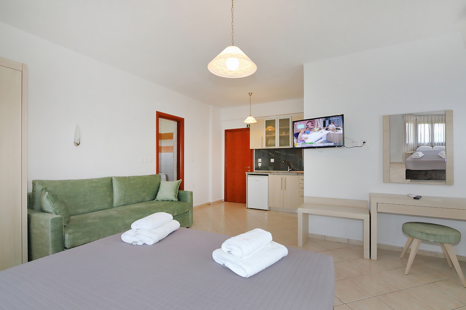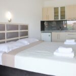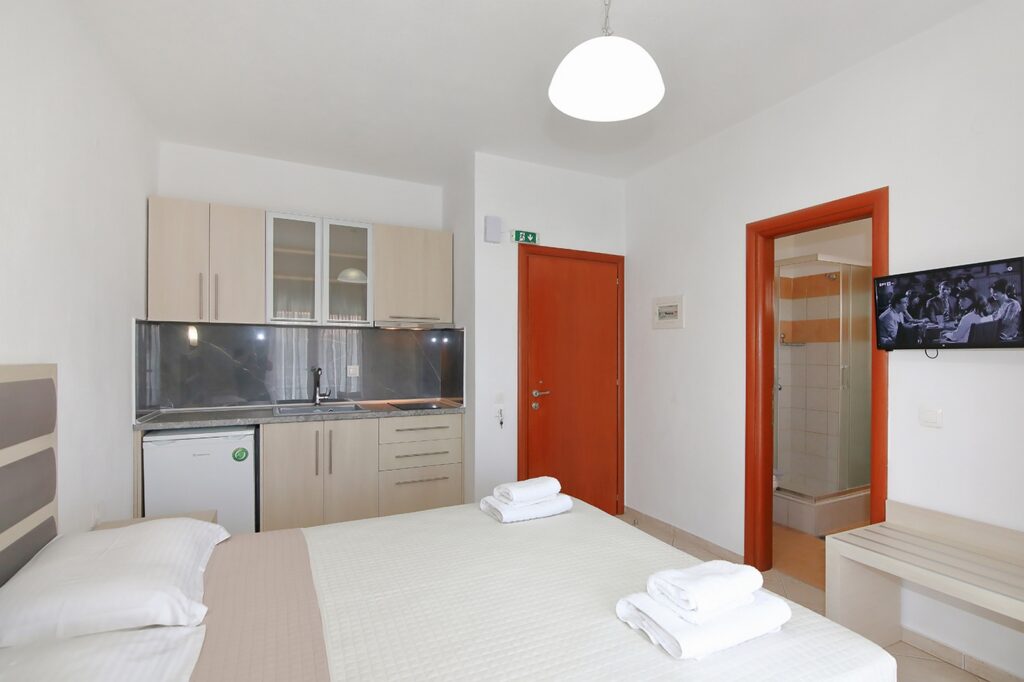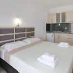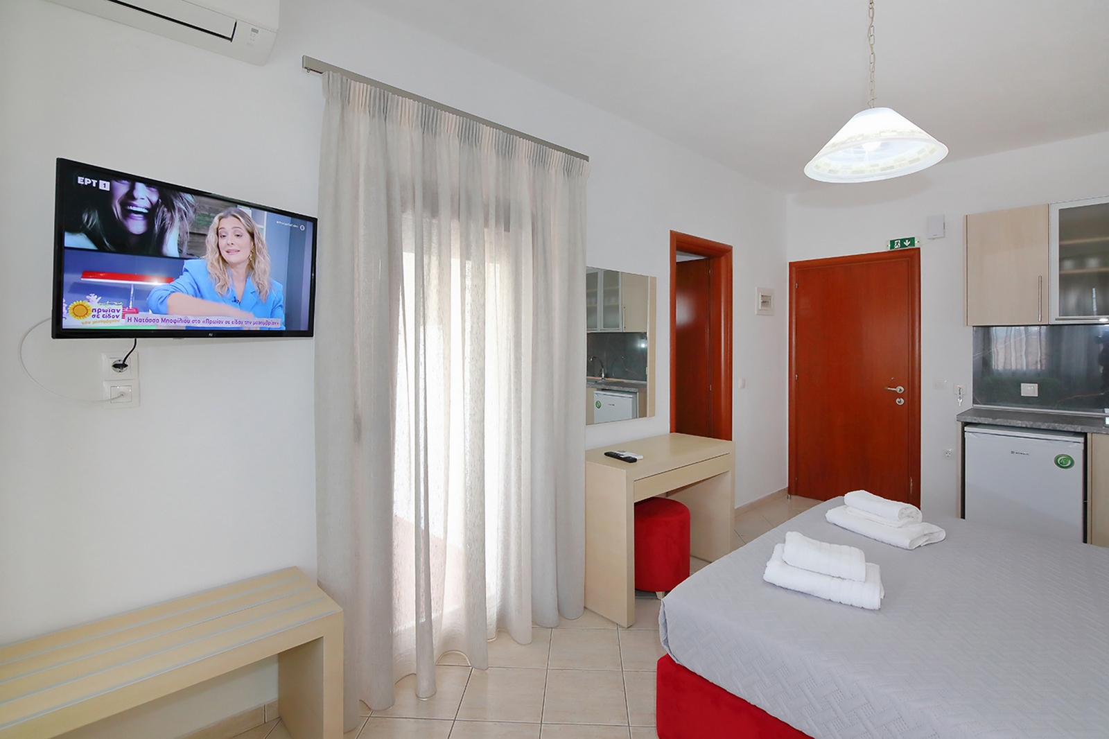 The modern complex “STUDIOS ANNIO” is located near the tourist center of Nikiti, 100 meters from the sandy beach. Surrounded by a beautiful garden with lawn, flowers, trees, a gazebo with barbecue and private parking. It has 8 studios and 1 two-room apartment that can accommodate up to 4 people and there is the possibility of extra bed upon request. All of our apartments are decorated with modern stylish furniture and fully equipped to ensure a comfortable stay.